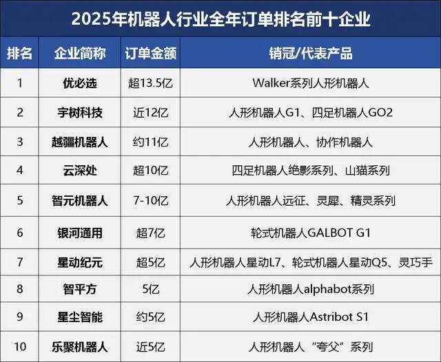 基于此,《智能新察看》基于当前息,拾掇2025年全年机械人行业的订单量,梳理出机械人订单的年度前十企业榜单,以机械人财产贸易化成效。(订单消息按照息拾掇,若有脱漏欢送大师)?。